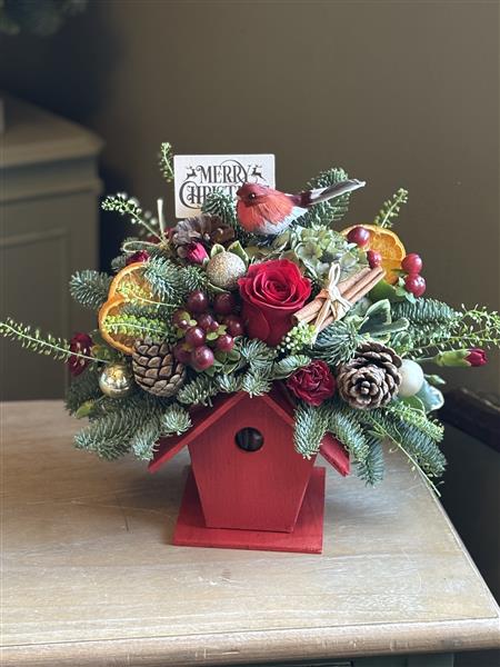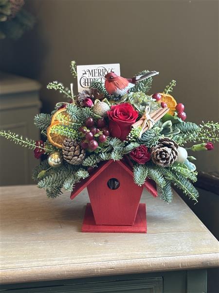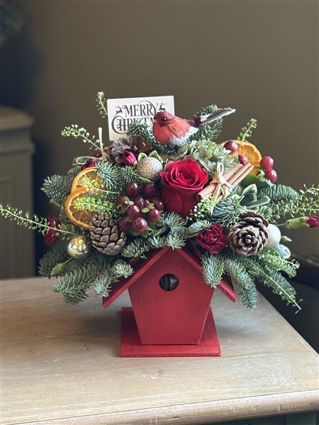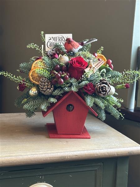 A festive red birdhouse adorned with fresh flowers, winter foliage and Christmas embellishments. Not forgetting a little red robin.