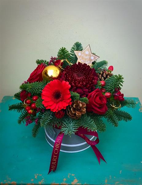 Make their Christmas merry and bright with a touch of holiday cheer. A beautiful Christmas flower displayed in a ribbon adorned hatbox. Free Wirral Delivery
